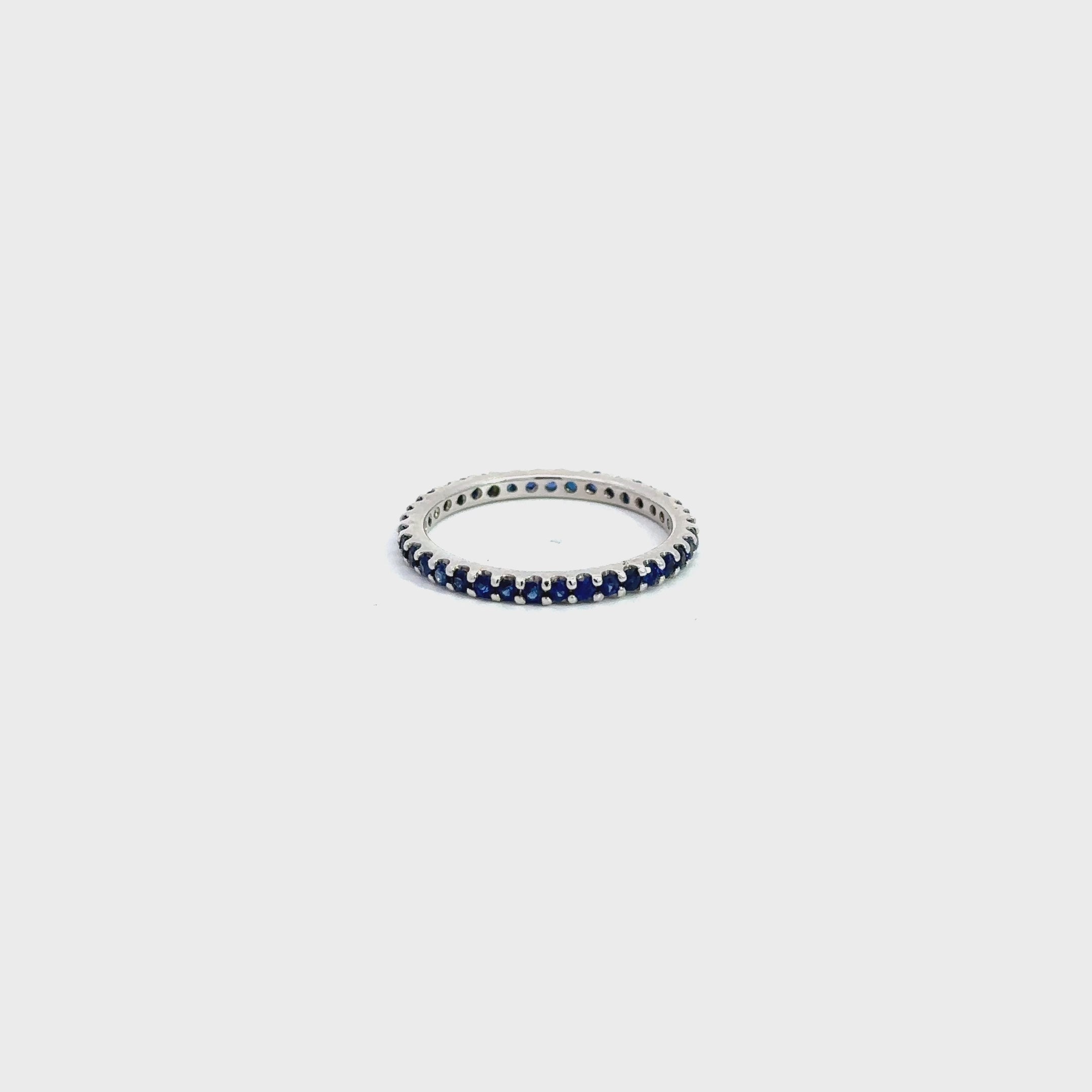 This beautiful shared prong set blue sapphire eternity band is a classic design, featuring shared prong set blue sapphires set around the entire ring. 14kt and blue sapphire band is the perfect complement to wear with stackable bands, and comes in your choice of a 14kt Rose gold, white gold or yellow gold setting.