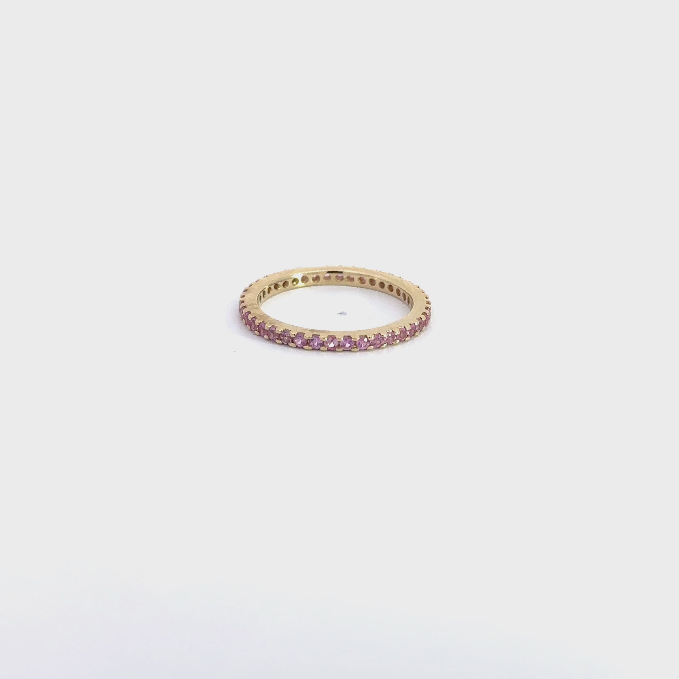 This beautiful shared prong set soft light pink sapphire eternity band is a classic design, featuring shared prong set pink sapphires set around the entire ring. 14kt and soft pink sapphire band is the perfect complement to wear with stackable bands, and comes in your choice of a 14kt Rose gold, white gold or yellow gold setting.