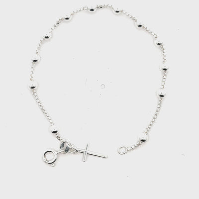 A timeless symbol of faith and devotion, this sterling silver rosary bracelet features polished round beads and a delicate cross charm. Its minimalist yet meaningful design makes it a beautiful piece to wear daily or layer with other bracelets for a subtle statement of spirituality and style.