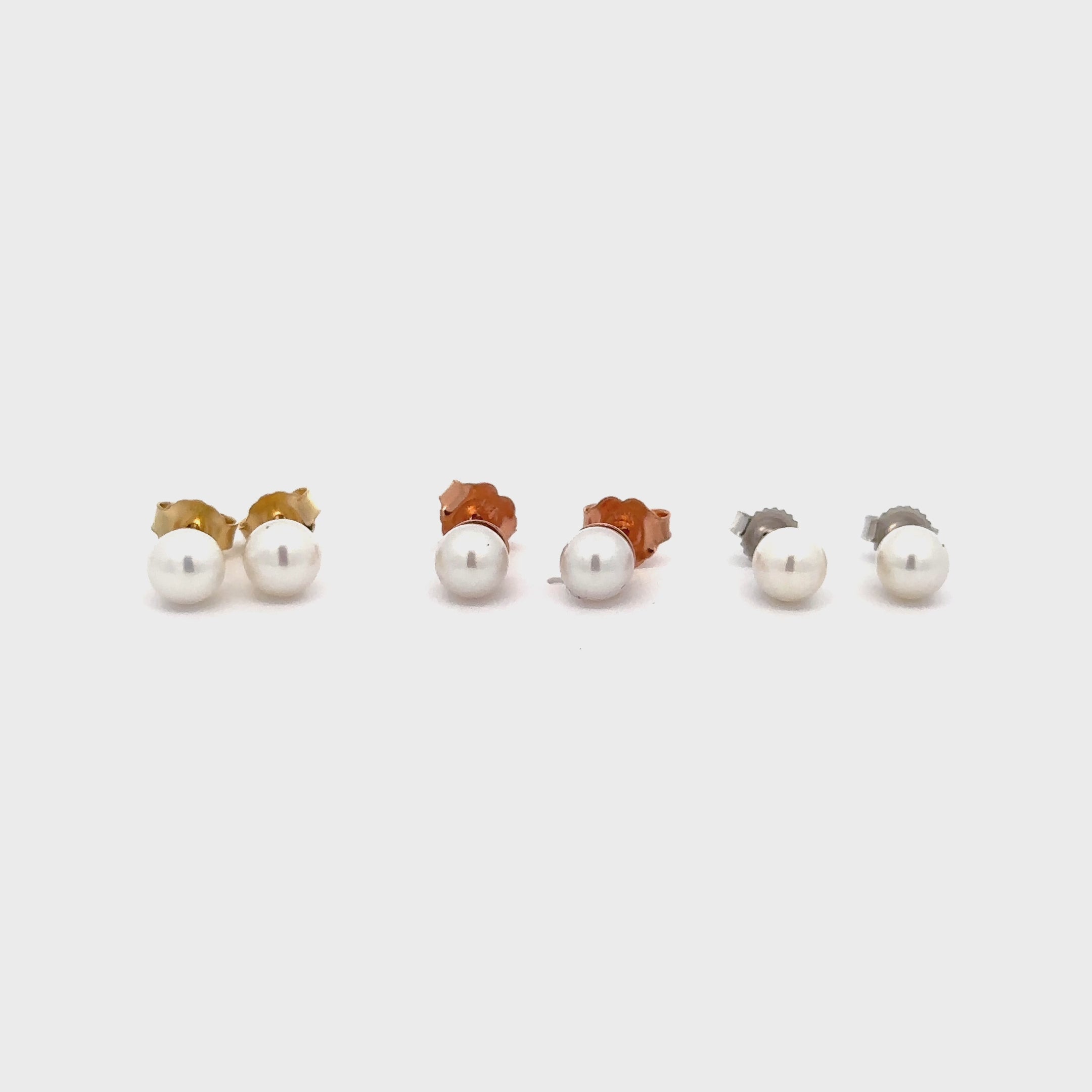 Introducing our elegant 14kt gold cultured pearl studs, available in rose gold, yellow gold, and white gold finishes. The 5mm cultured pearls feature a classic round shape and lustrous sheen that complements any outfit.