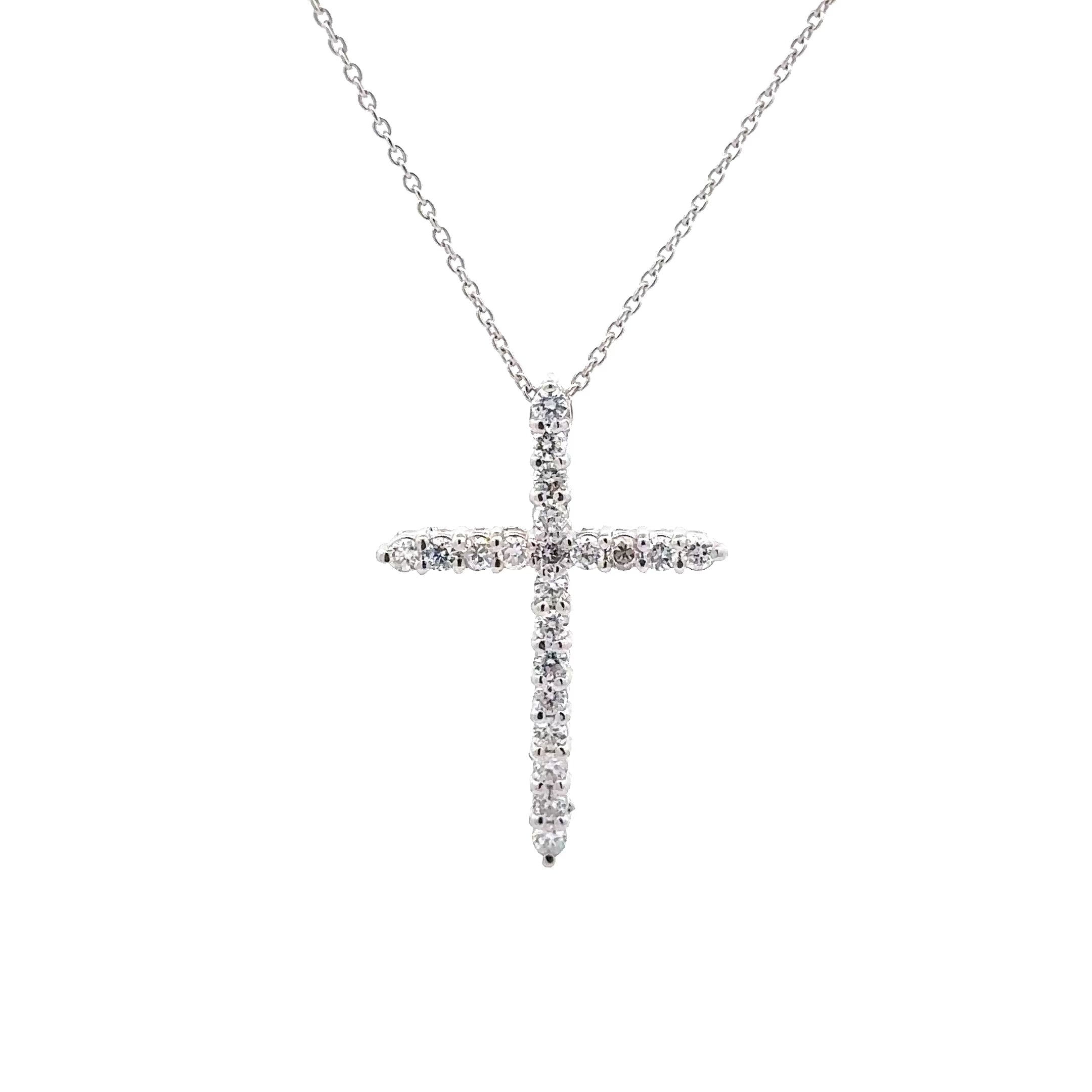 Introducing our exquisite 14 karat white gold cross necklace, adorned with dazzling prong-set diamonds. The shimmering diamonds are carefully placed in a delicate setting, creating a stunning visual appeal that is sure to turn heads. Crafted with precision and elegance, this necklace exudes luxury and sophistication.