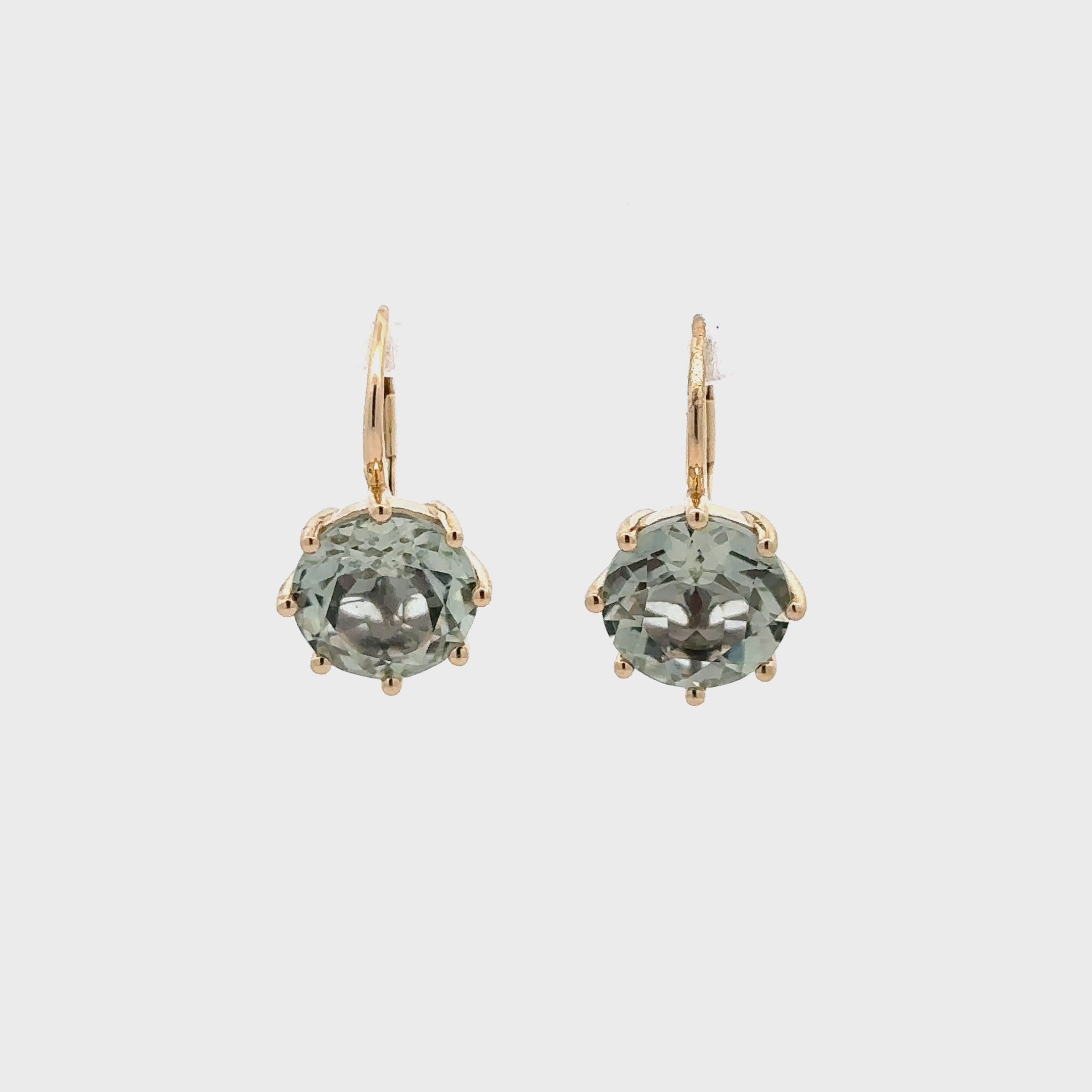 Enhance your elegance with these stunning 14kt round cut Green Amethyst earrings. The simple yet elegant design features eight prong-set stones that delicately dangle from your ears, creating a captivating and sophisticated look. Add a touch of glamour to any outfit with these exquisite earrings that are sure to leave people speechless.