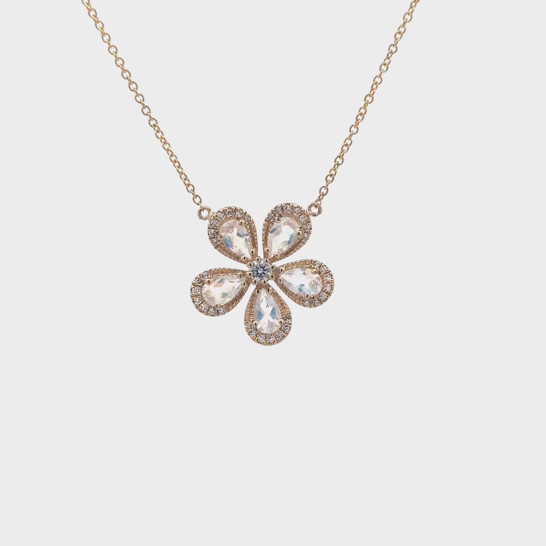 This exquisite moonstone and diamond petal necklace features a delicate design that captures the essence of nature's beauty. Crafted with shimmering moonstones and diamond halos, it adds a touch of elegance to any outfit, making it perfect for both casual and formal occasions.