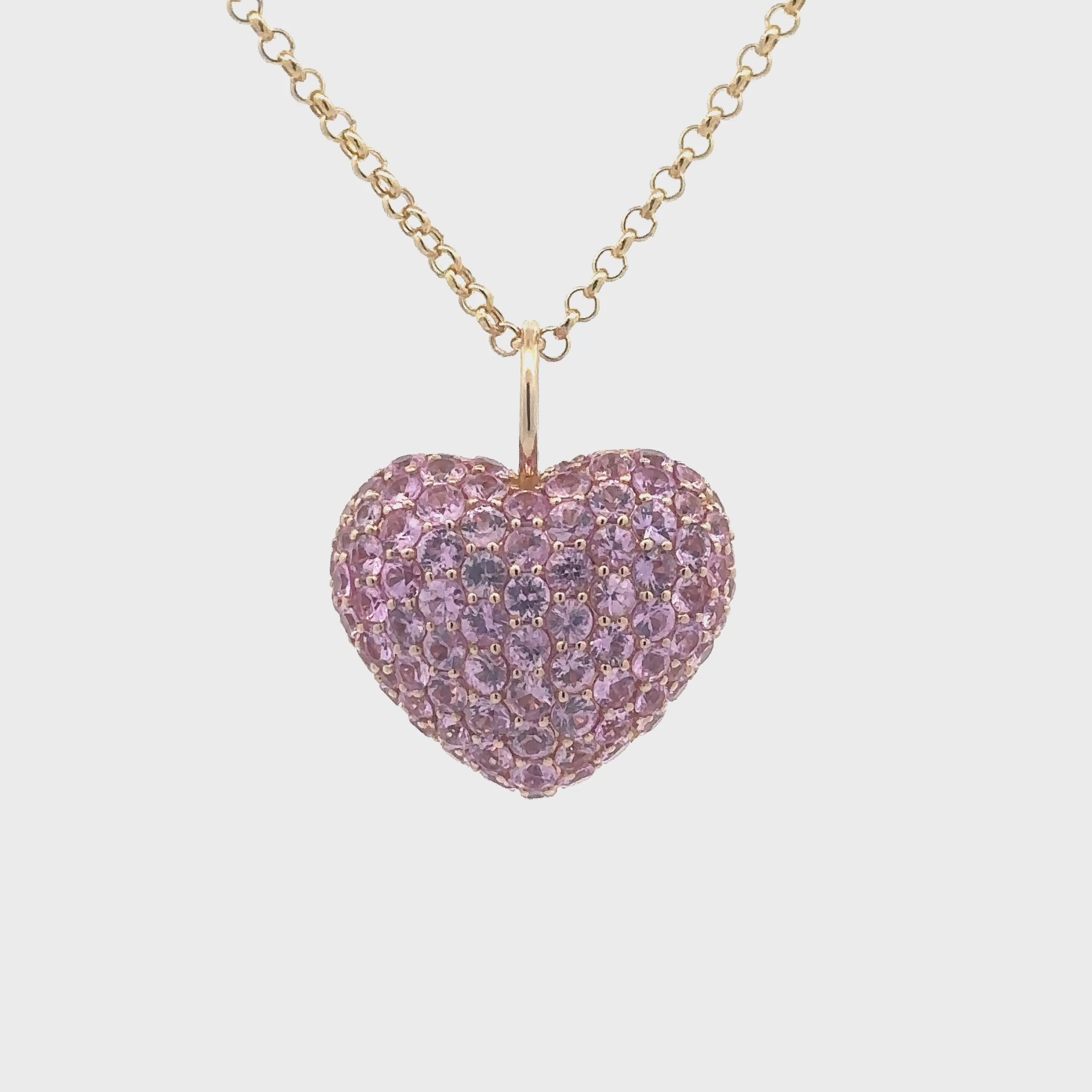 A sweet statement with serious sparkle. This dimensional (“puffy”) heart is blanketed in pavé-set pink sapphires and finished with a smooth 14k gold bail. Romantic, fun, and easy to wear every day—shine solo or layer it into your favorite stack.