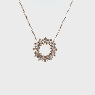 Radiate sophistication with this exquisite baquette circle diamond necklace. Featuring a mesmerizing sunburst design, this pendant is crafted from lustrous yellow gold, elegantly suspending from a delicate chain. The meticulously arranged baguette cut diamonds add a touch of modern glamour, making it a perfect statement piece for any occasion.