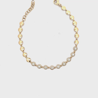 Indulge in timeless elegance with this exquisite diamond bracelet, crafted from radiant yellow gold. The delicate design features a series of lustrous gold discs, interspersed with dazzling round cut diamonds set in brilliant settings. A perfect fusion of sophistication and understated glamour.