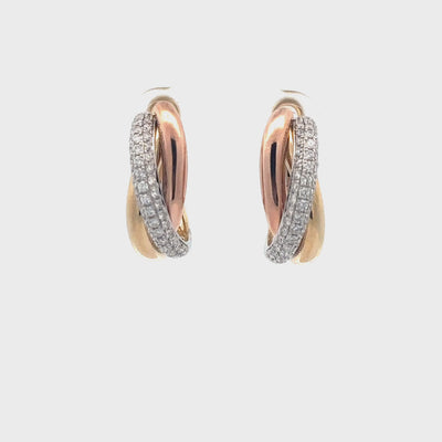 Elevate your style with these exquisite tri-color hoop earrings, meticulously crafted from radiant gold. The unique design features a harmonious blend of yellow, rose, and white gold, adorned with brilliant pave diamonds. These elegant earrings showcase a seamless integration of luxury and sophistication, making them an impeccable addition to any jewelry collection.