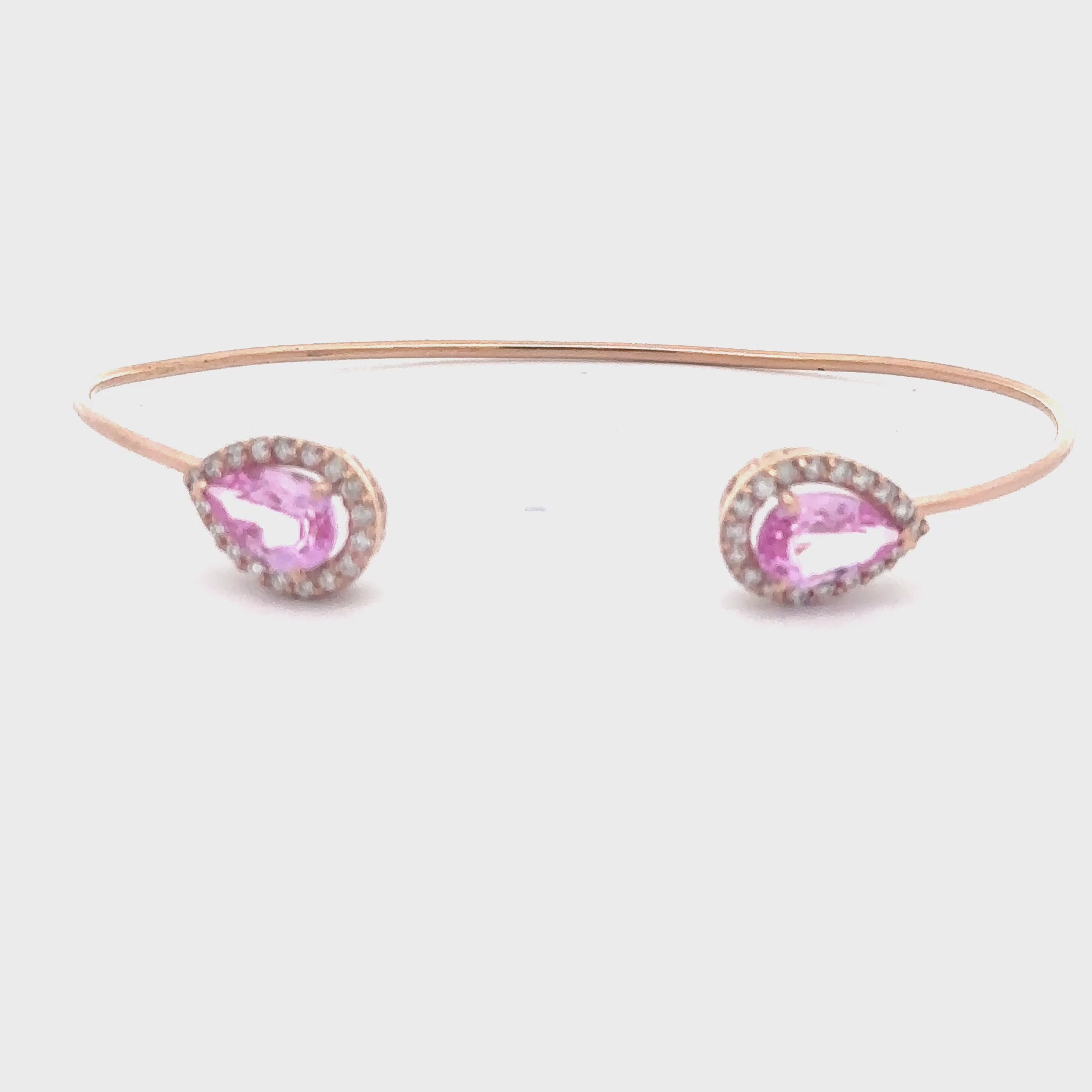 Exquisite rose gold Pink Zircon Cuff with Diamond Halo, each showcasing a brilliant cut that enhances their captivating light pink hue. This sophisticated piece radiates refined elegance and showcases expert craftsmanship.