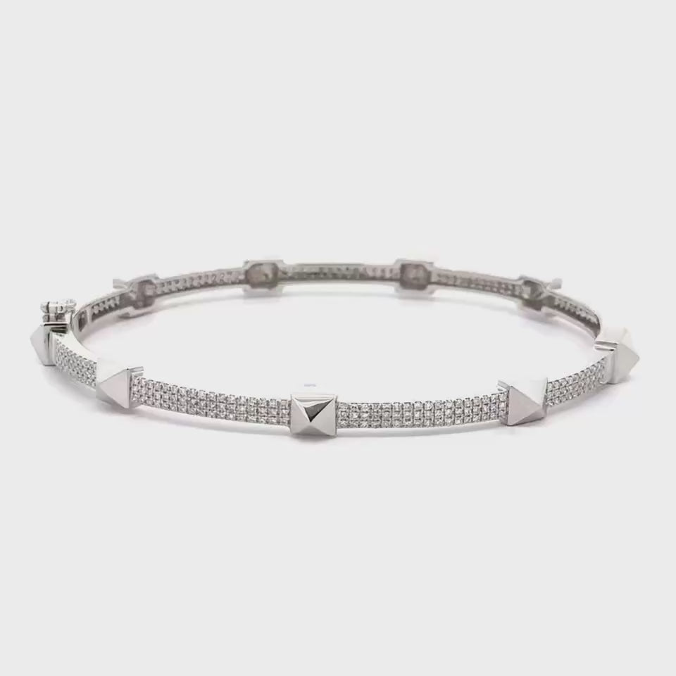 Embrace modern elegance with this 14kt white gold bangle. Featuring meticulously set, pave diamonds along its circumference, accented with geometric studs motifs. This white gold bangle offers a harmonious blend of sparkle and contemporary design, making it a sophisticated addition to any jewelry collection.