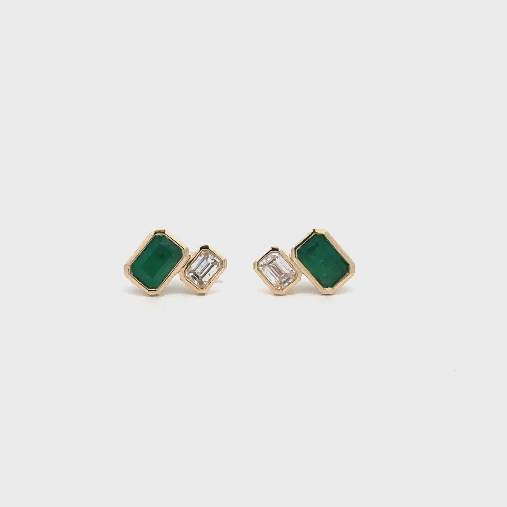 Elevate your style with these sophisticated stud earrings featuring vivid green emerald gemstones and diamonds set in lustrous yellow gold. The clean lines and minimalist design showcase the radiant color of the emerald, enhanced by the step cut that offers sleek sparkle and brilliance. A luxurious addition to any jewelry collection.