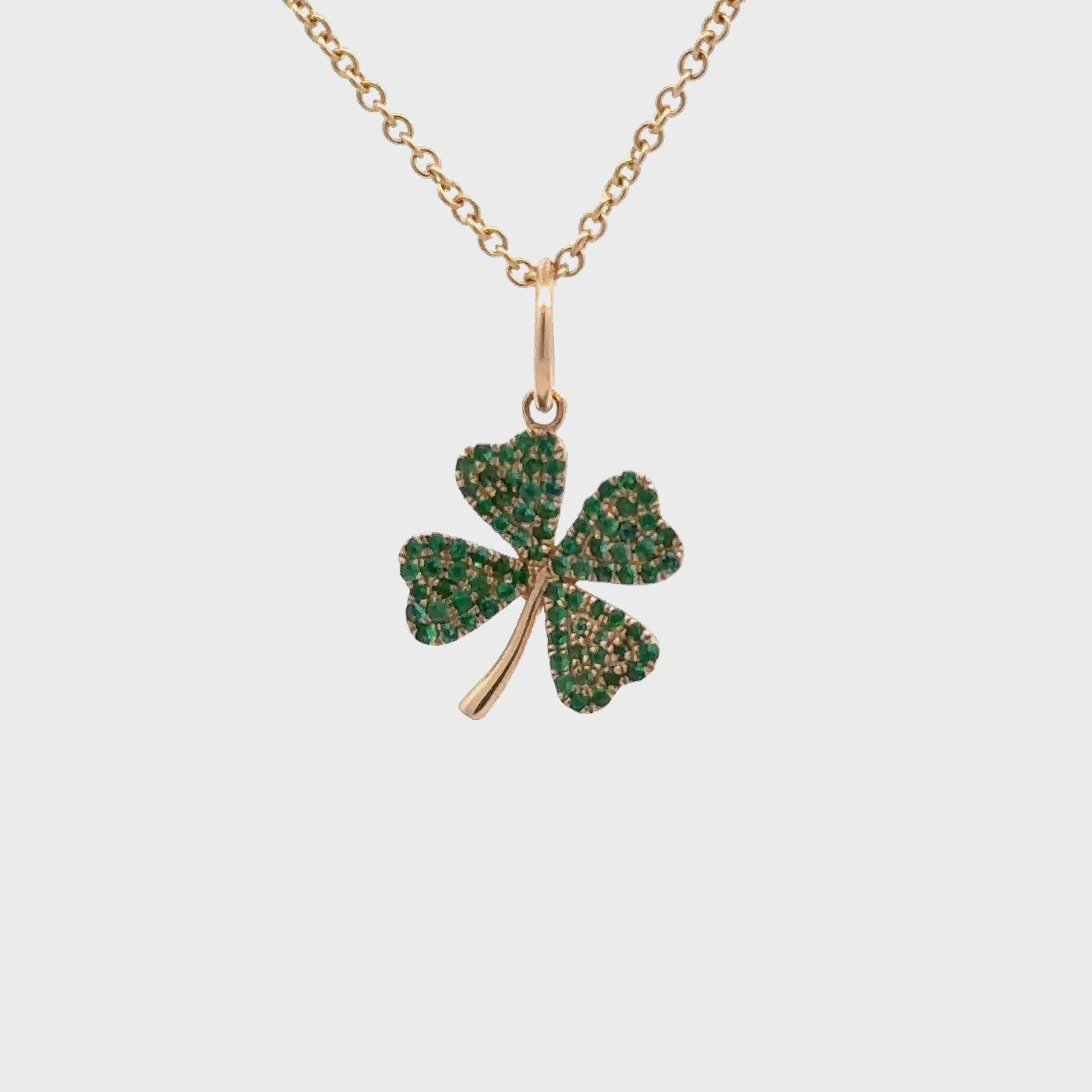 The lucky four leaf clover pendant, adorned with Pave emerald gemstones. This piece offers a touch of whimsical elegance. It's a perfect addition to any jewelry collection, offering both beauty and symbolic significance. Shown with optional chain. To choose the chain option click here