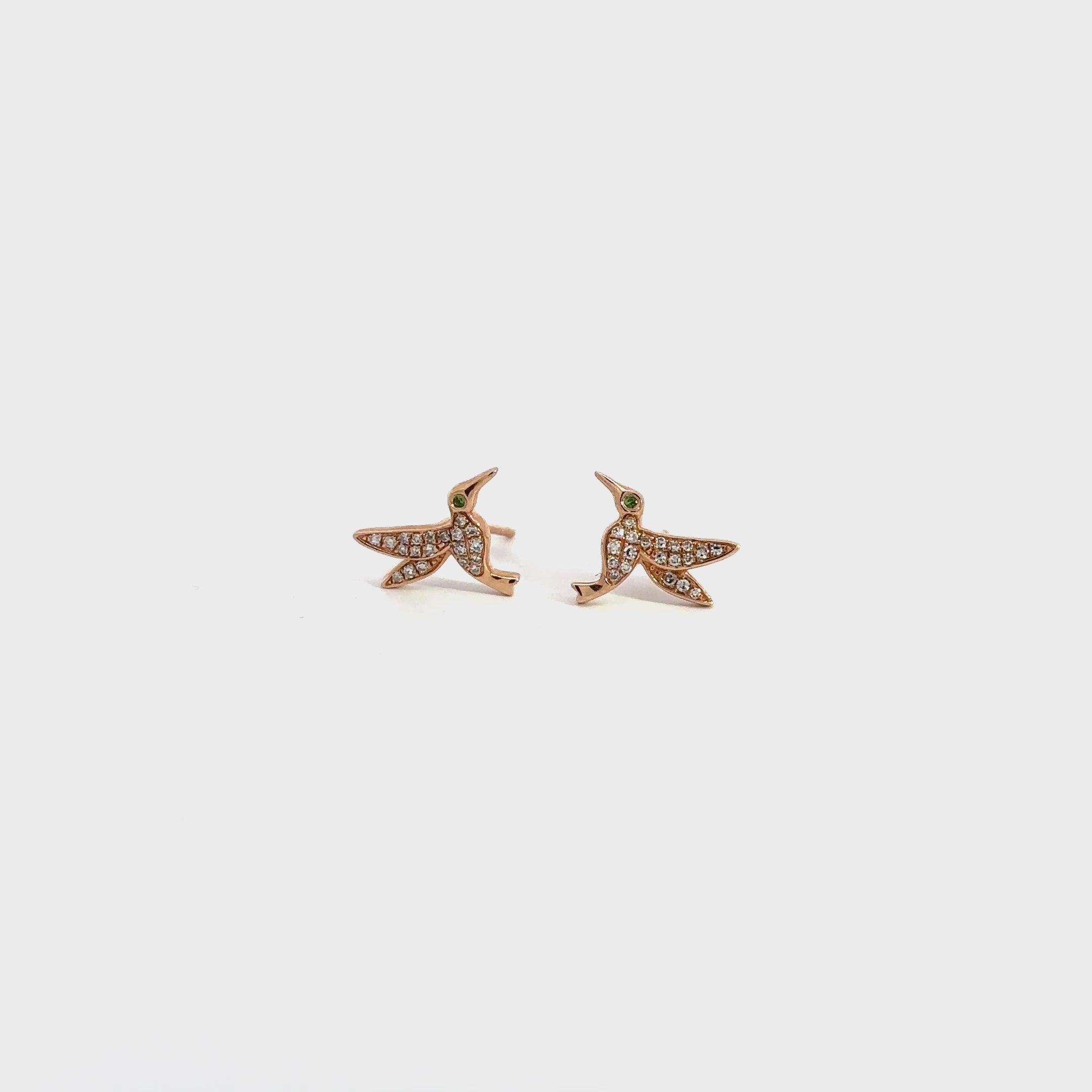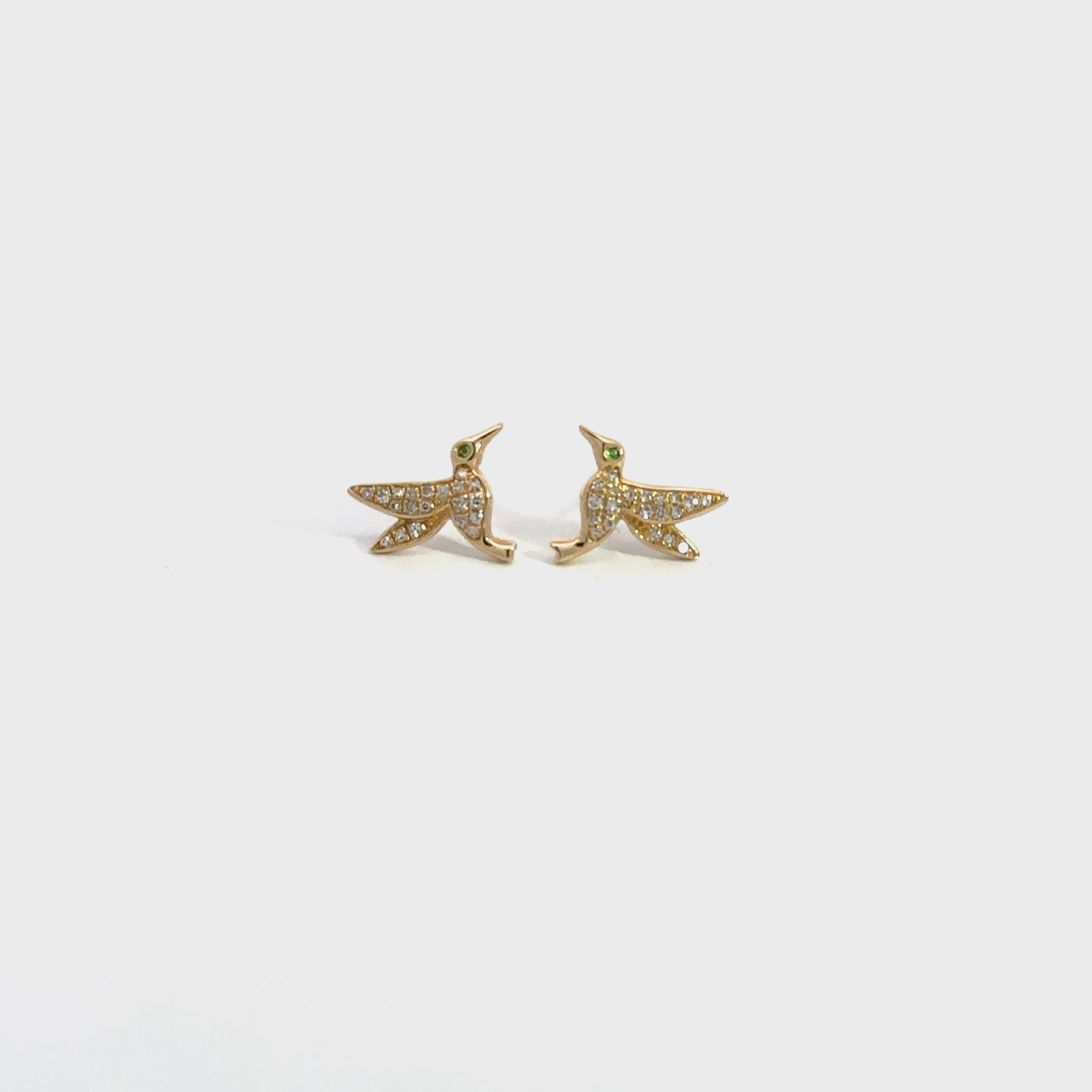 Let your playful side loose as you go about your day with these pave diamond hummingbird studs with emerald stud eyes.